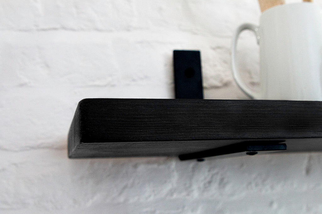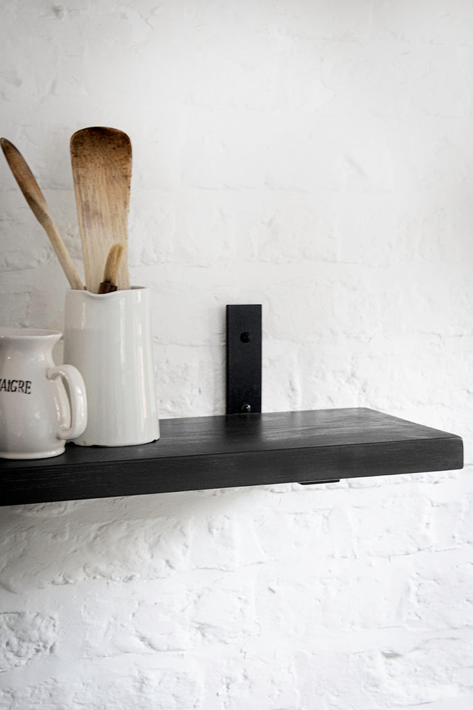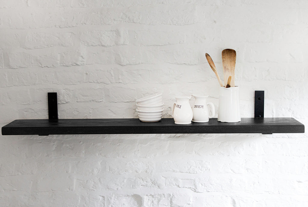 A strong and robust bracket shelf, combining a sustainable solid wood, colour and natural wax treated board together with two heavy duty, powder coated steel wall brackets in matt black. Sturdy enough to carry kitchenware, books or bathroom essentials. Completes a modern rustic look in any room.