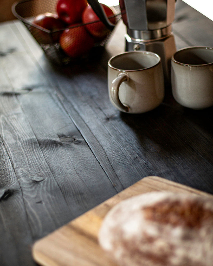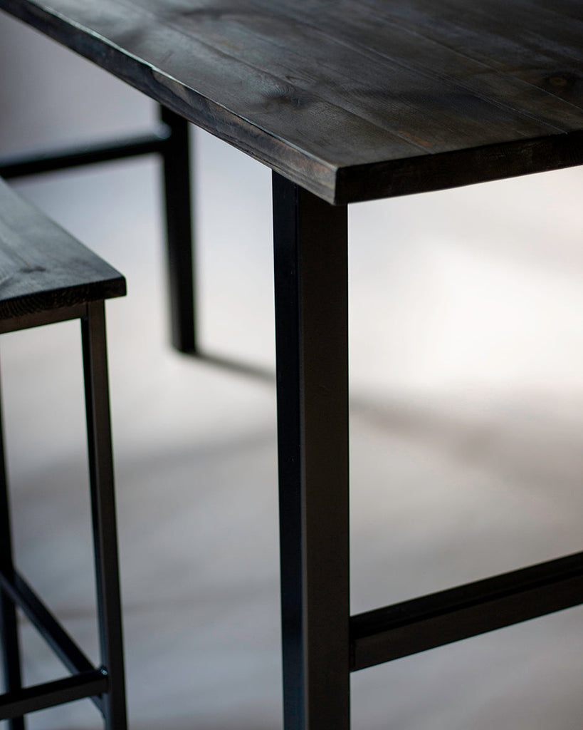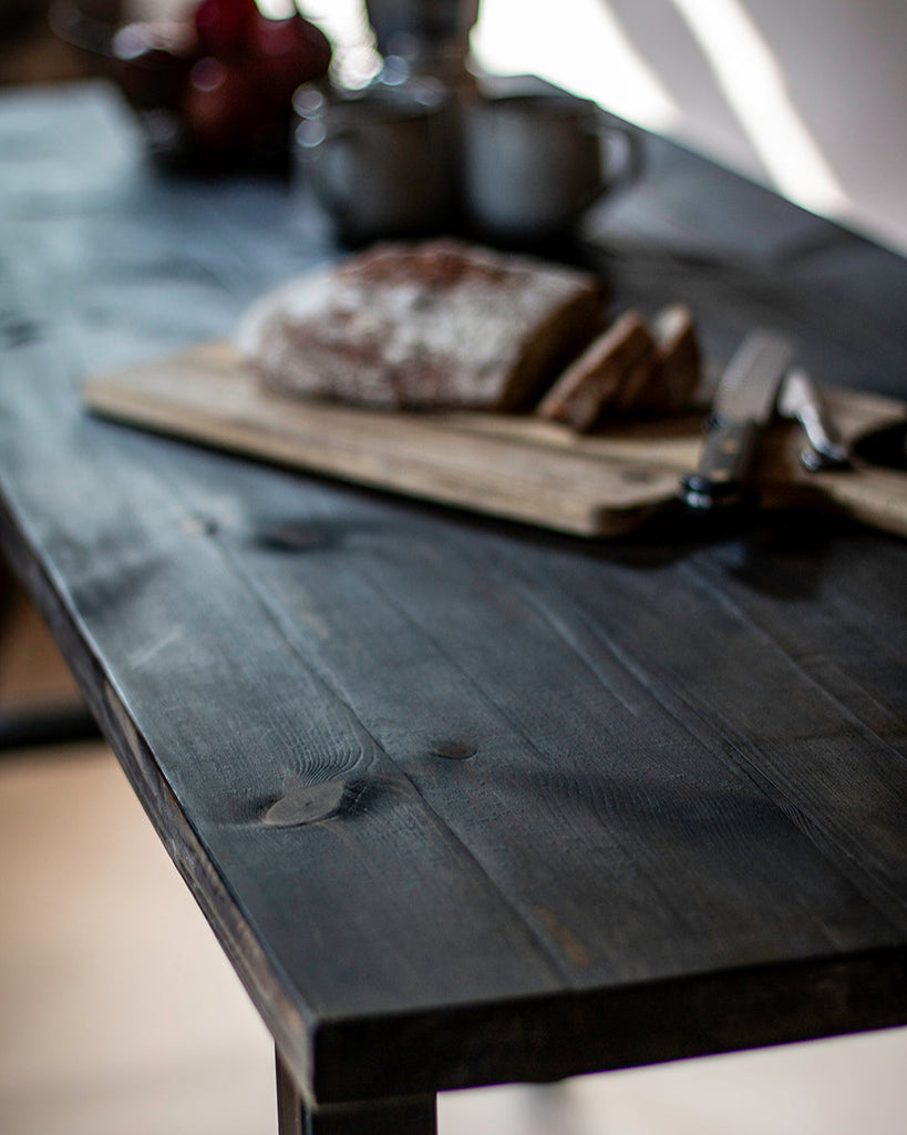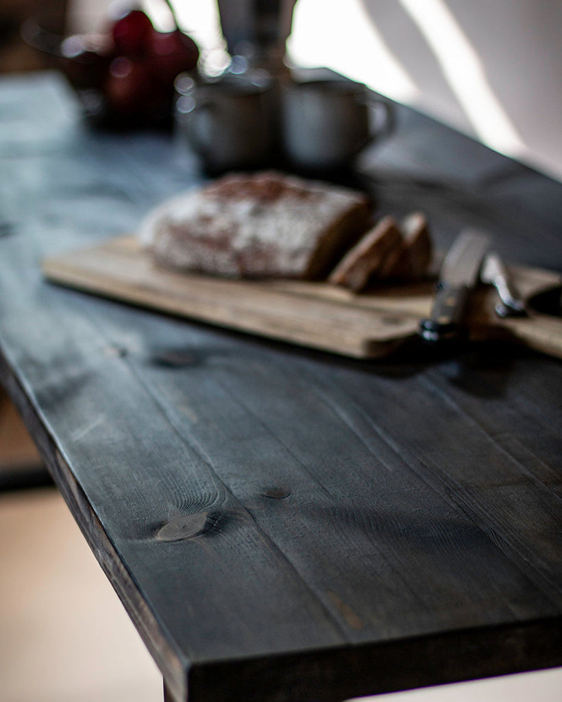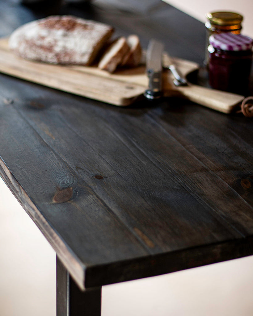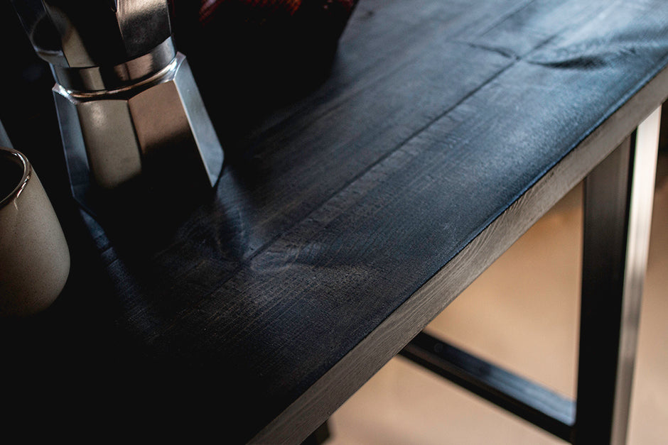 • Pre-joined, 'charred' solid wood table top. Comes with pre-drilled holes on underside to locate steel legs.